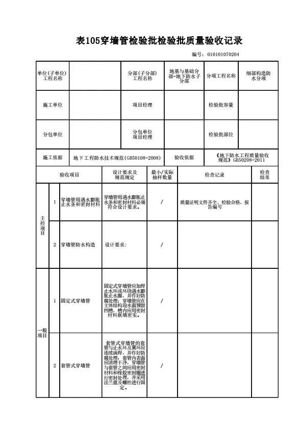 表格名称:010101070204 穿墙管检验批检验批质量验收记录