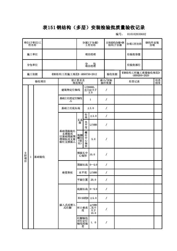 表格名称:010102030602 钢结构(多层)安装检验批质量验收记录