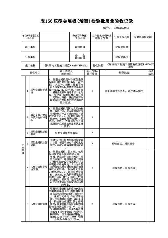 表格名称:010102030701 压型金属板(墙面)检验批质量验收记录