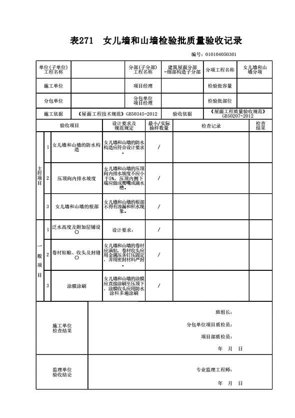 表格名称:010104050301 女儿墙和山墙检验批质量验收记录