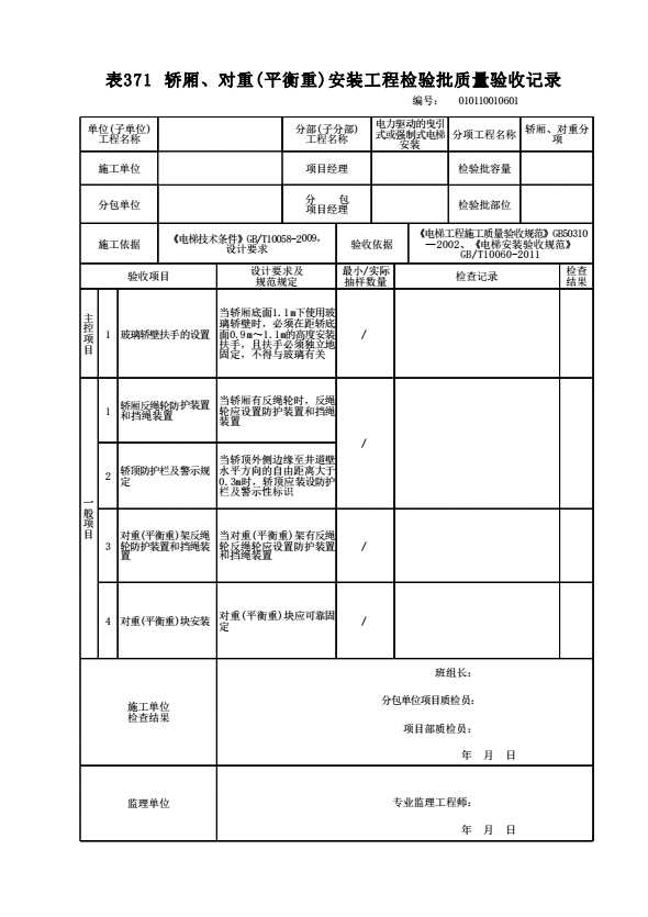 表格名称:010110010601 轿厢、对重(平衡重)安装工程检验批质量验收记录