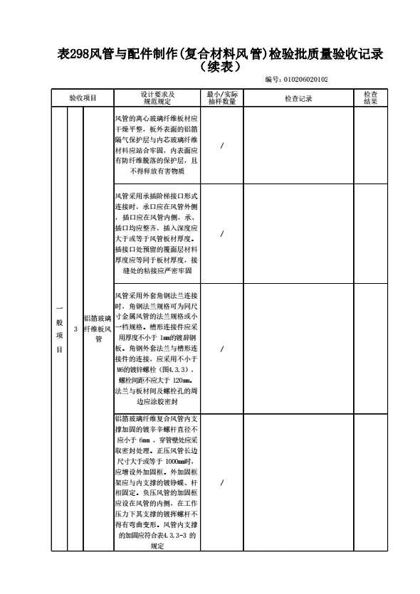 表格名称:010206020102 风管与配件制作(复合材料风管)检验批质量验收记录
