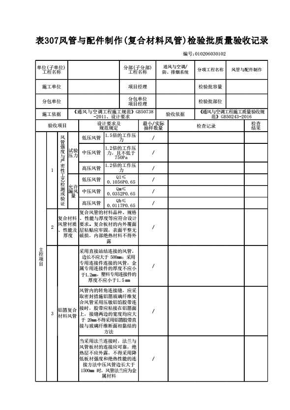 表格名称:010206030102 风管与配件制作(复合材料风管)检验批质量验收记录