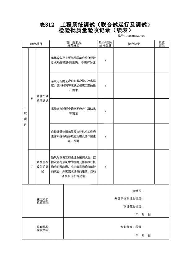 表格名称:010206030702 工程系统调试(联合试运行及调试)检验批质量验收记录