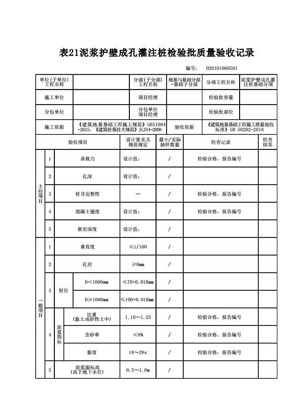 表格名称:020101060501 泥浆护壁成孔灌注桩检验批质量验收记录