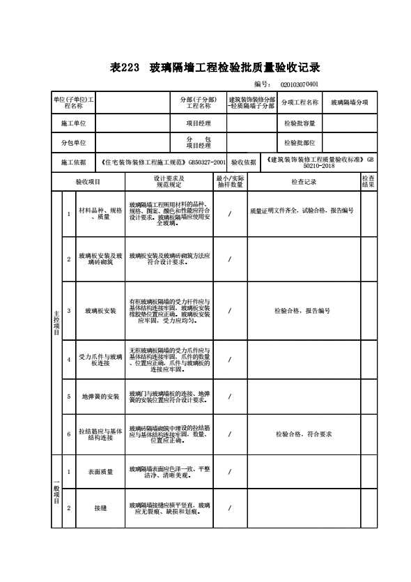 020103070401 玻璃隔墙工程检验批质量验收记录