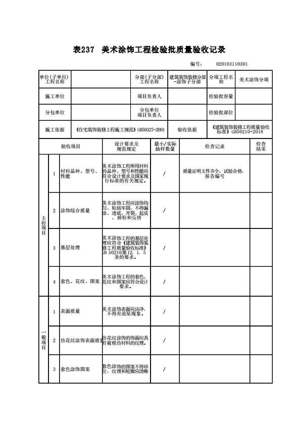 表格名称:020103110301 美术涂饰工程检验批质量验收记录