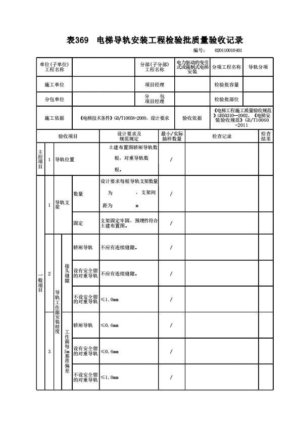 表格名称:020110010401 电梯导轨安装工程检验批质量验收记录