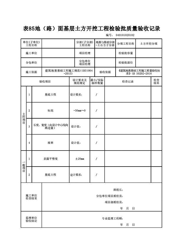 表格名称:040101020102 地(路)面基层土方开挖工程检验批质量验收记录