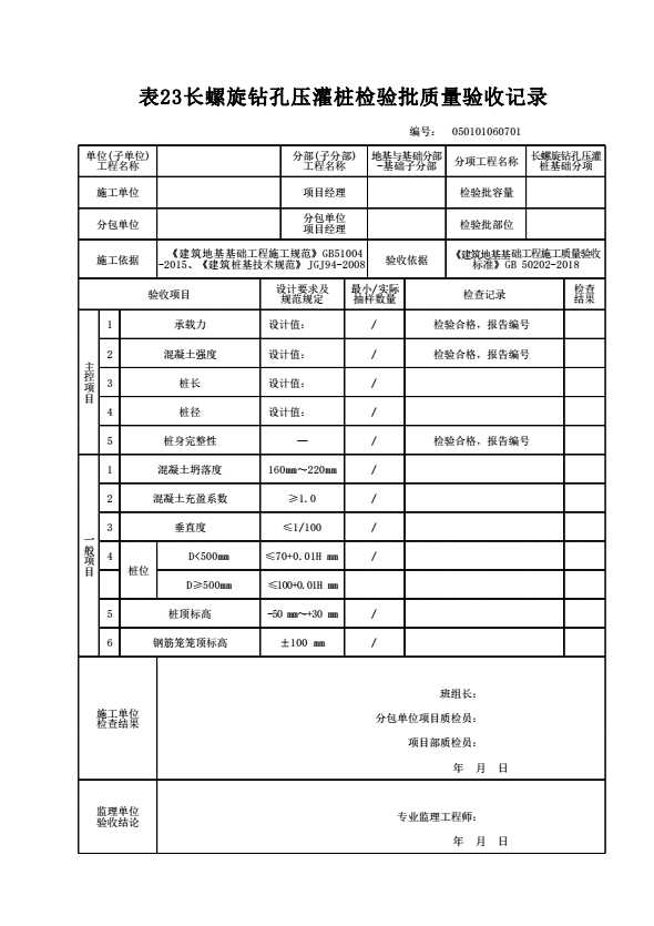 表格名称:050101060701 长螺旋钻孔压灌桩检验批质量验收记录
