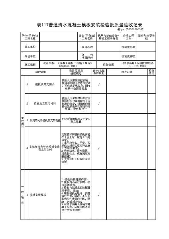 表格名称:050201060305 普通清水混凝土模板安装检验批质量验收记录
