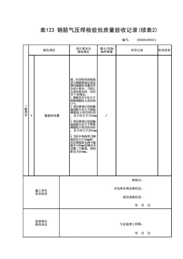 表格名称:050201060311 钢筋气压焊检验批质量验收记录