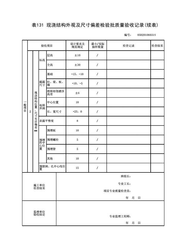 表格名称:050201060319 现浇结构外观及尺寸偏差检验批质量验收记录
