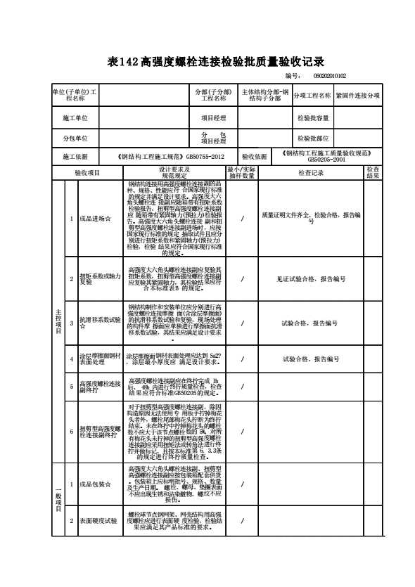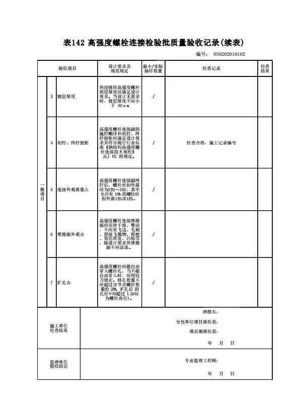 表格名称:050202010102 高强度螺栓连接检验批质量验收记录