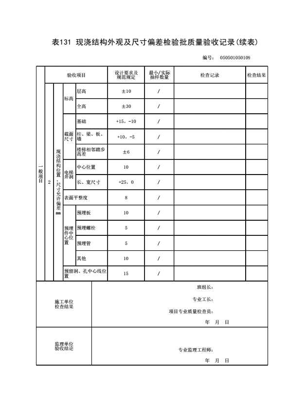 表格名称:050501050109 现浇结构外观及尺寸偏差检验批质量验收记录
