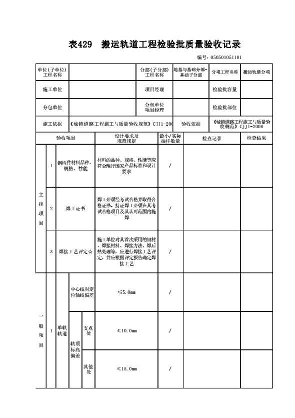 表格名称:050501051101 搬运轨道工程检验批质量验收记录