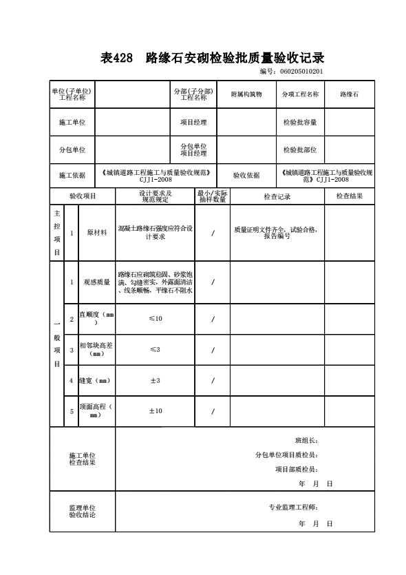 表格名称:060205010201 路缘石安砌检验批质量验收记录