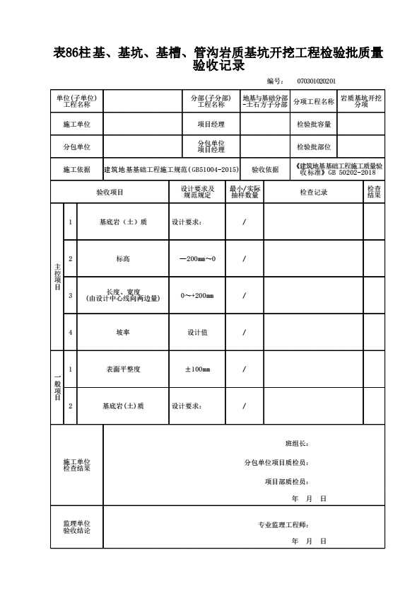 表格名称:070301020201 柱基、基坑、基槽、管沟岩质基坑开挖工程检验批质量验收记录