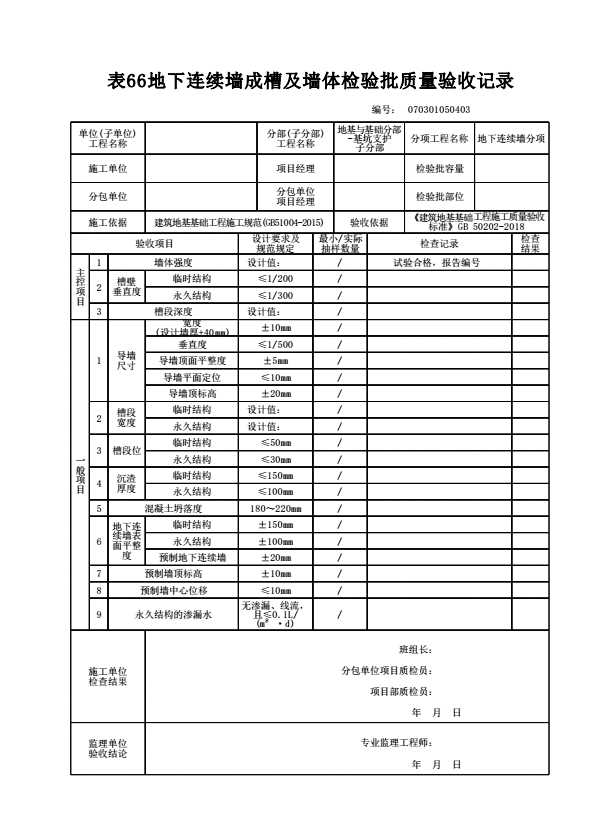 表格名称:070301050403 地下连续墙成槽及墙体检验批质量验收记录