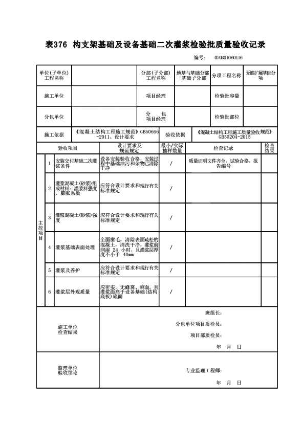 表格名称:070301060116 构支架基础及设备基础二次灌浆检验批质量验收记录