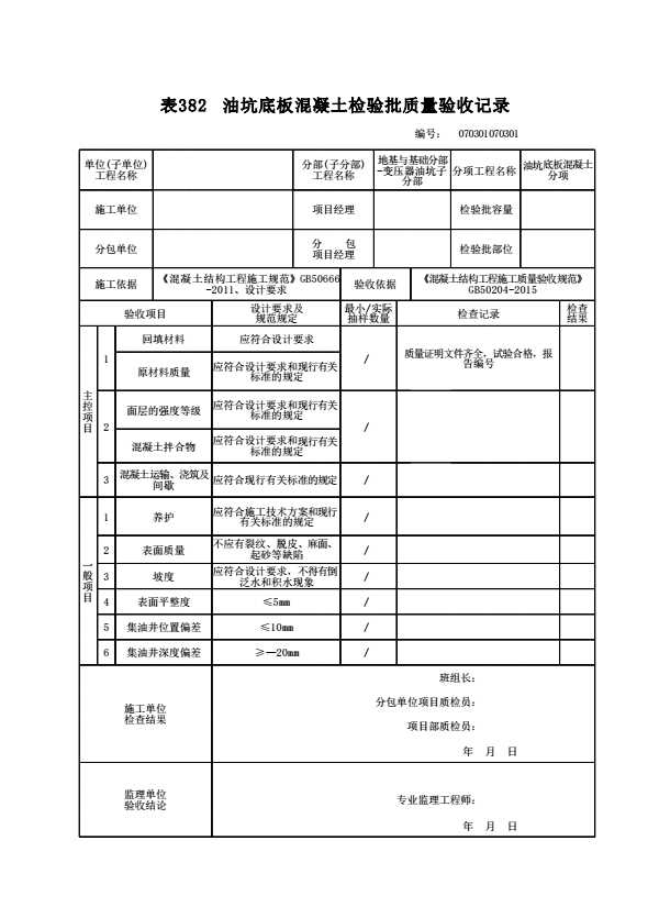 表格名称:070301070301 油坑底板混凝土检验批质量验收记录