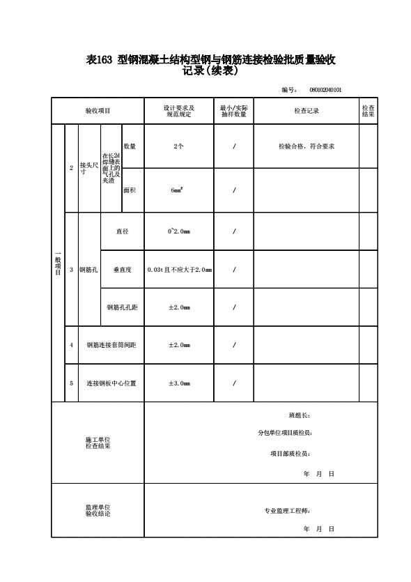 表格名称:080102040101 型钢混凝土结构型钢与钢筋连接检验批质量验收记录