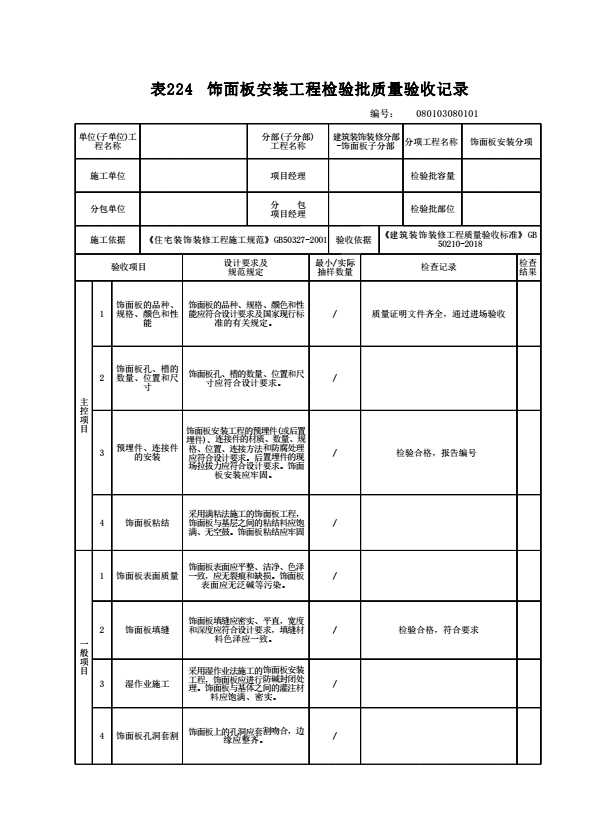 表格名称:080103080101 饰面板安装工程检验批质量验收记录