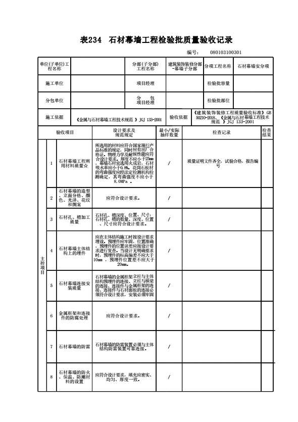 表格名称:080103100301 石材幕墙工程检验批质量验收记录