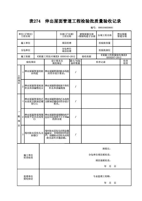 表格名称:080104050601 伸出屋面管道工程检验批质量验收记录
