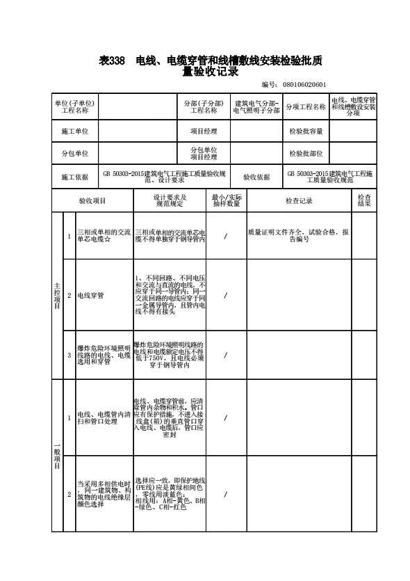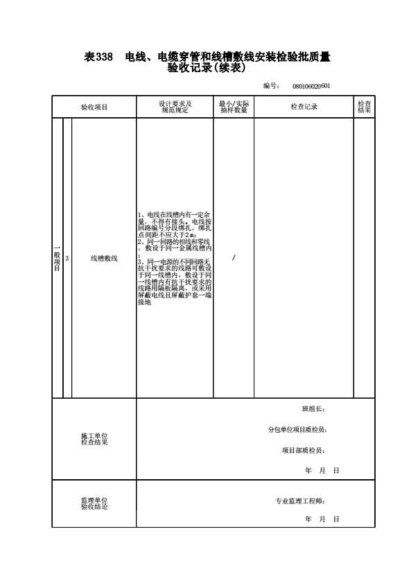 表格名称:080106020601 电线、电缆穿管和线槽敷线安装检验批质量验收记录