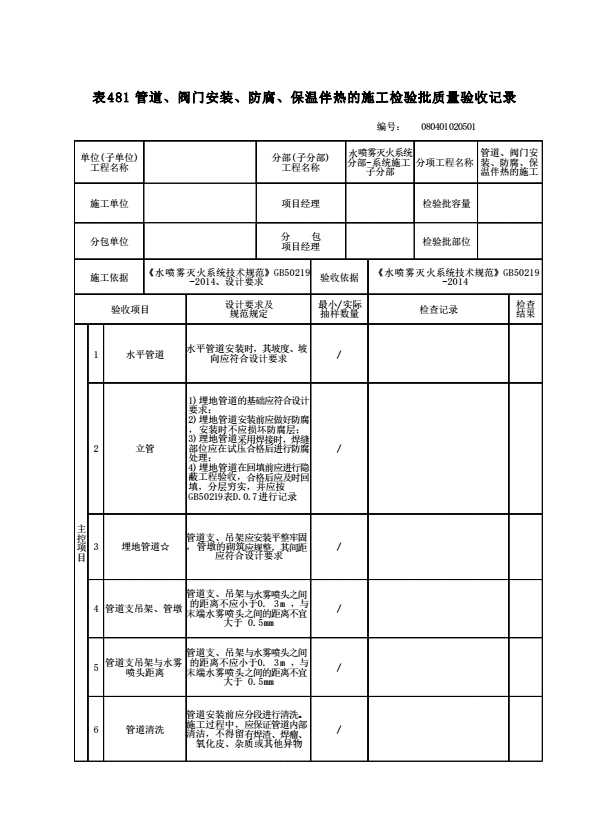 表格名称:080401020501 管道、阀门安装、防腐、保温伴热的施工检验批质量验收记录