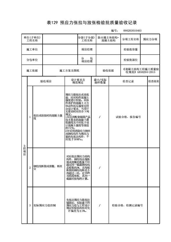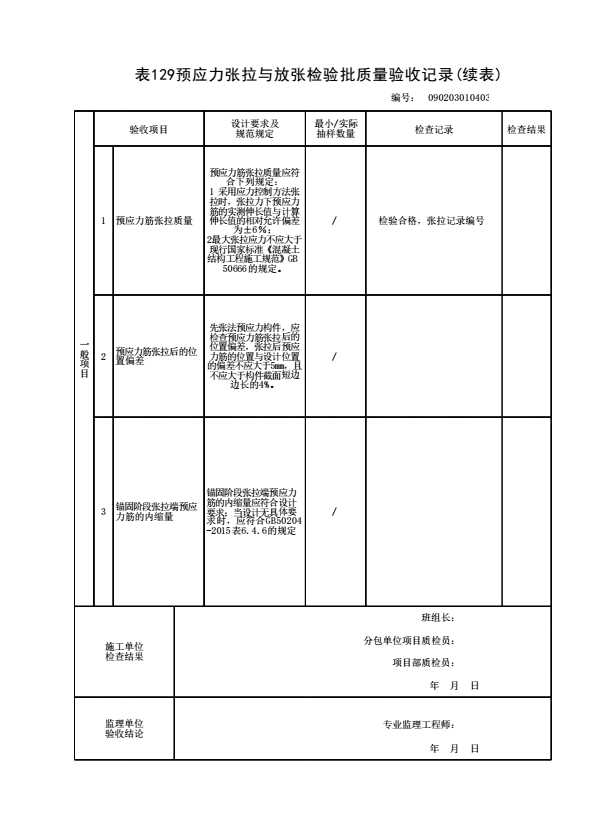 表格名称:090203010403 预应力张拉与放张检验批质量验收记录