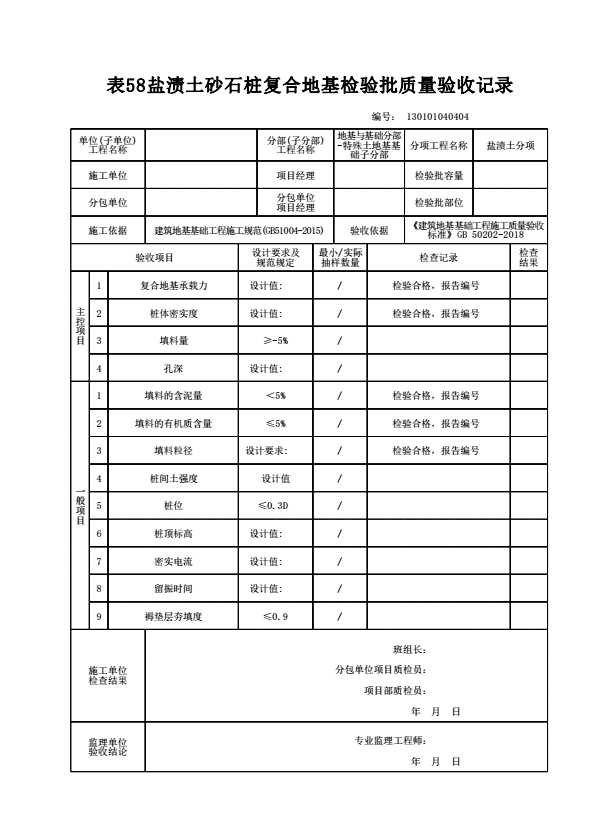 表格名称:130101040404 盐渍土砂石桩复合地基检验批质量验收记录