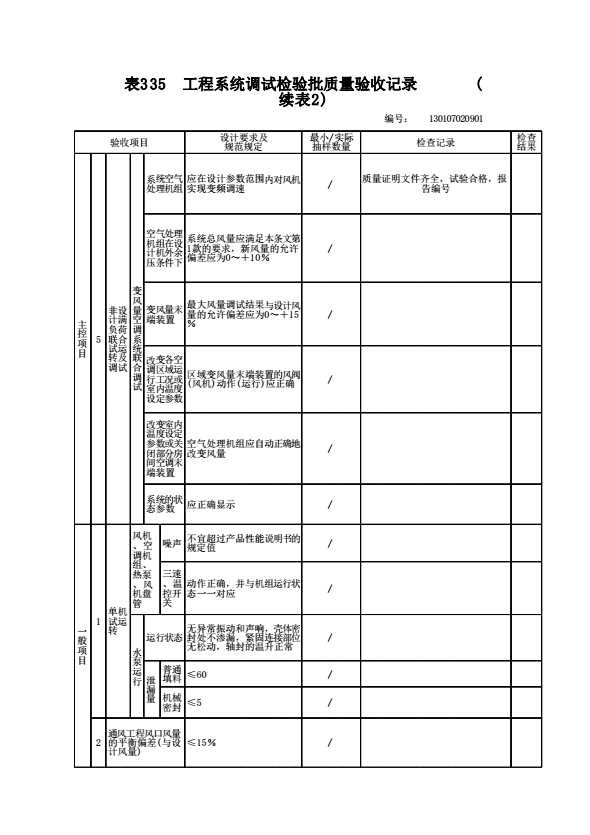 130107020901 工程系统调试检验批质量验收记录