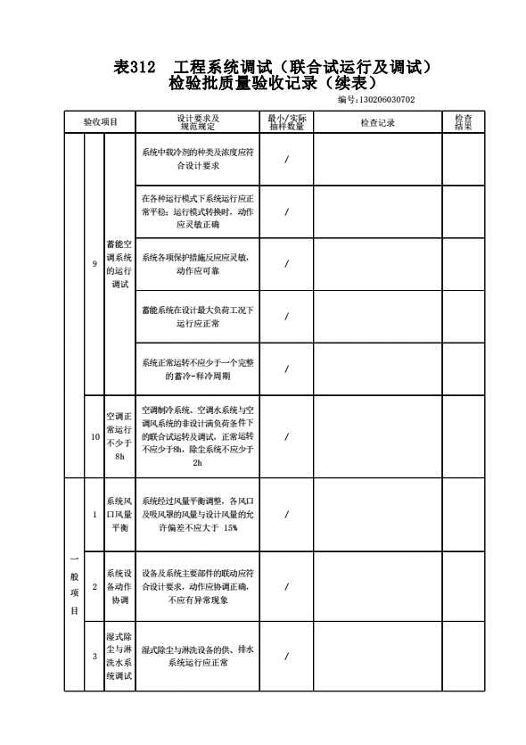 表格名称:130206030702 工程系统调试(联合试运行及调试)检验批质量验收记录