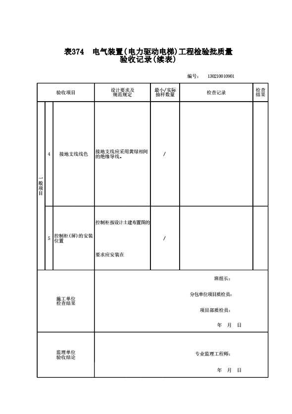 130210010901 电气装置(电力驱动电梯)工程检验批质量验收记录
