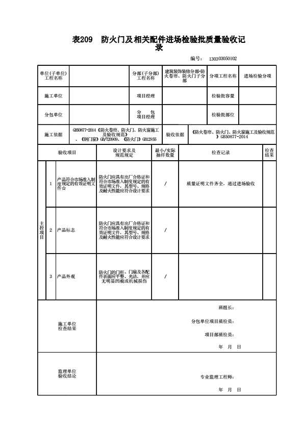 表格名称:130303050102 防火门及相关配件进场检验批质量验收记录