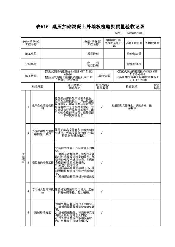 表格名称:140001020302 蒸压加砌混凝土外墙板检验批质量验收记录