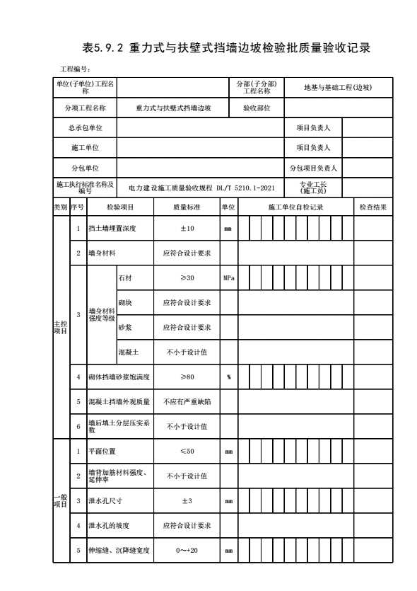表格名称:表5.9.2 重力式与扶壁式挡墙边坡检验批质量验收记录