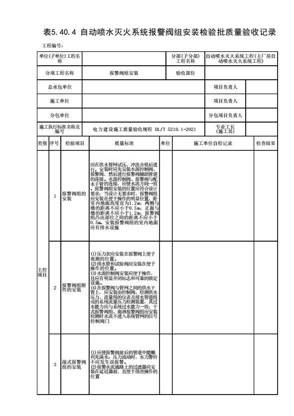表格名称:表5.40.4 自动喷水灭火系统报警阀组安装检验批质量验收记录