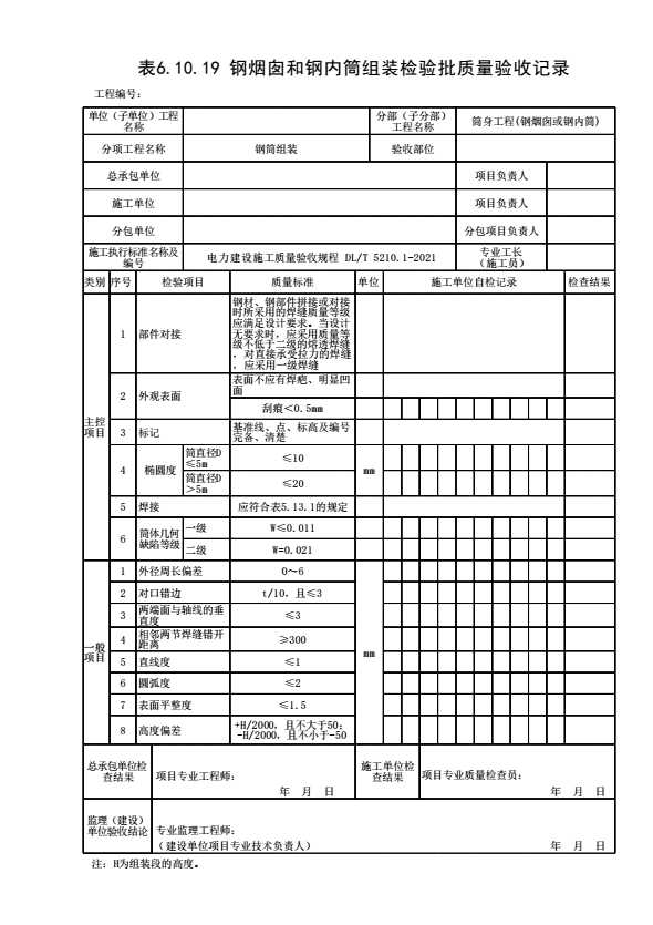 表格名称:表6.10.19钢烟囱和钢内筒组装检验批质量验收记录
