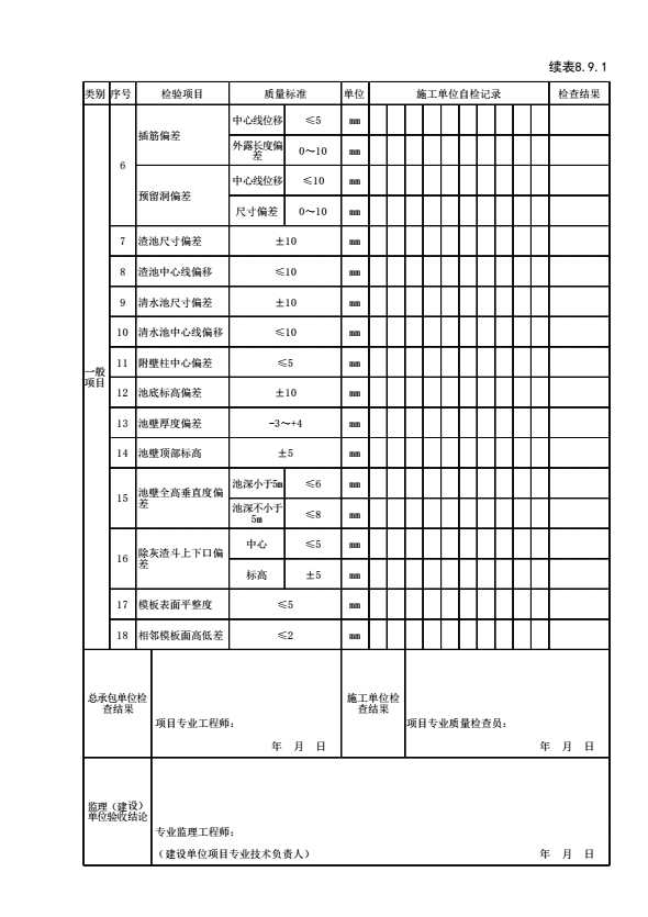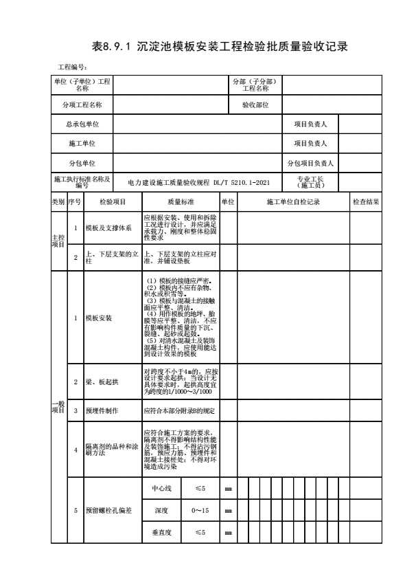 表格名称:表8.9.1沉淀池模板安装工程检验批质量验收记录