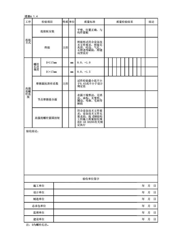 表格名称:表6.1.4 钢结构安装检验批施工质量验收表