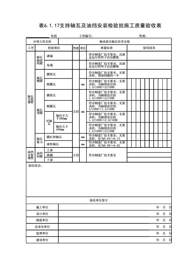 表格名称:表6.1.17 支持轴瓦及油挡安装检验批施工质量验收表