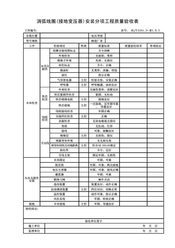 表格名称:表1.0.3 消弧线圈(接地变压器)安装分项工程质量验收表