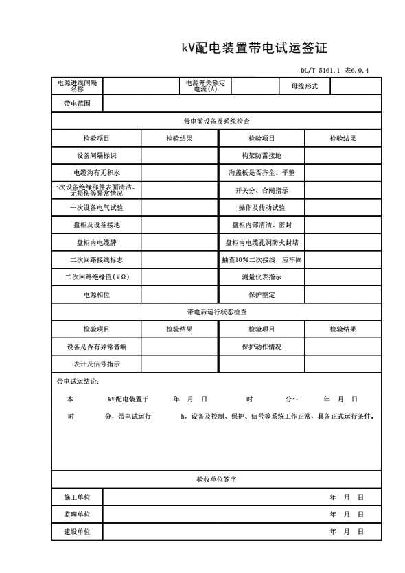 表格名称:表6.0.4 XXXkV配电装置带电试运签证