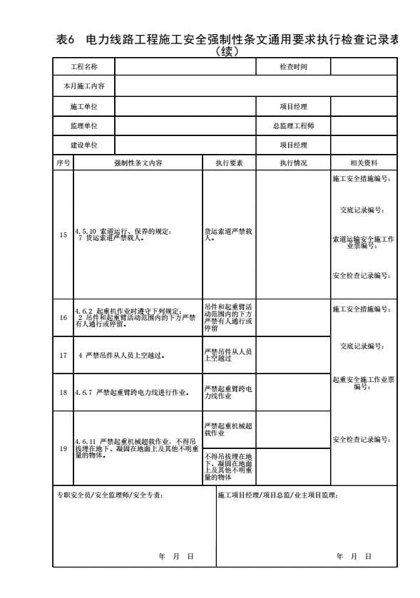 表格名称:表6 电力线路工程施工安全强制性条文通用要求执行检查记录表
