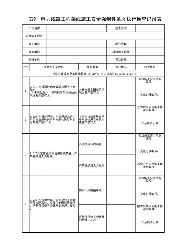 表格名称:表9 电力线路工程架线施工安全强制性条文执行检查记录表