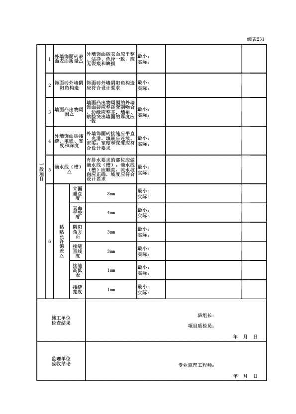 表格名称:010203090101 外墙饰面砖粘贴工程检验批质量验收记录