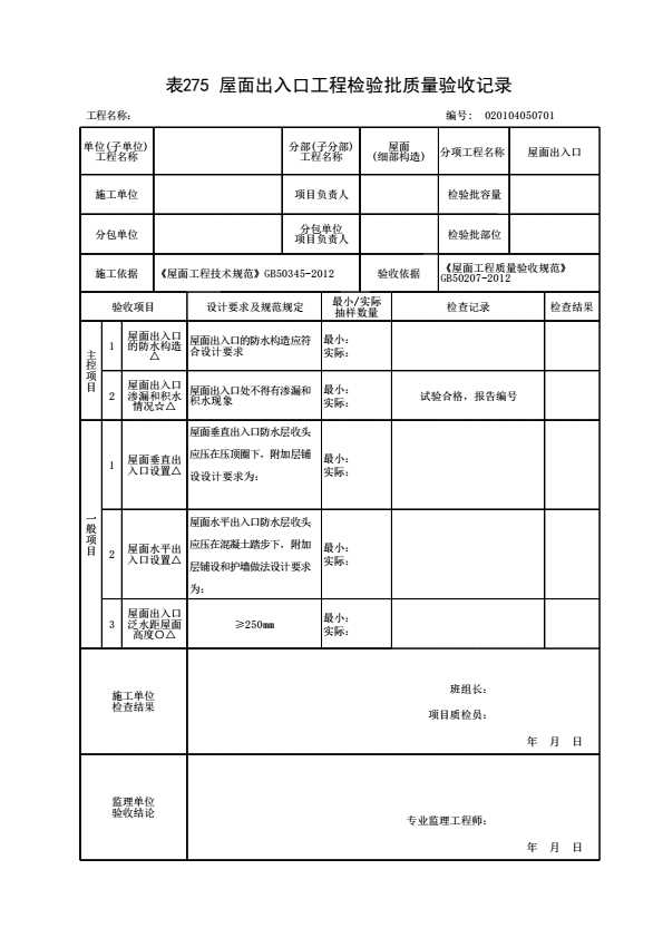 表格名称:020104050701 屋面出入口工程检验批质量验收记录